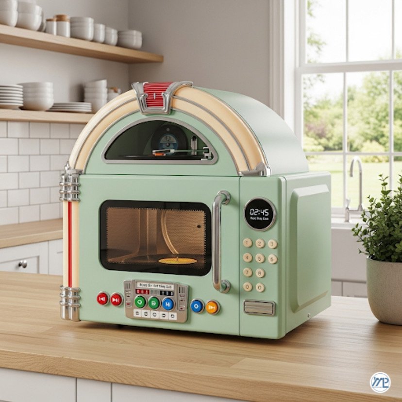 Nostalgia meets modern design with the retro microwave, a concept inspired by 1950s aesthetics but powered by today’s smart technology. With rounded edges, pastel colors, chrome details, and analog-style dials, this model adds vintage warmth and personality to any home.