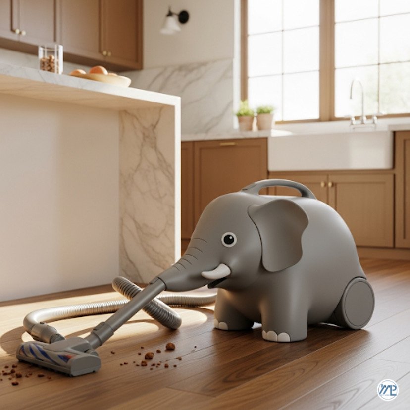 The vacuum’s design is instantly recognizable: a rounded, sculptural body in soft gray tones, accented with large, smooth curves. The main hose extends like an elephant’s trunk, capable of multi-directional movement for versatile cleaning. When powered on, a gentle hum resembling an elephant’s rumble adds a layer of personality and charm.